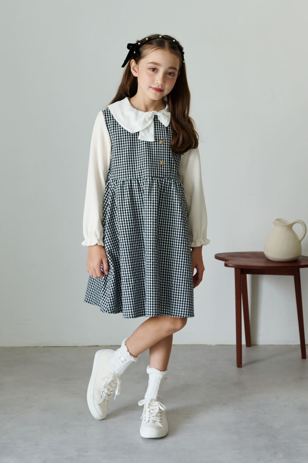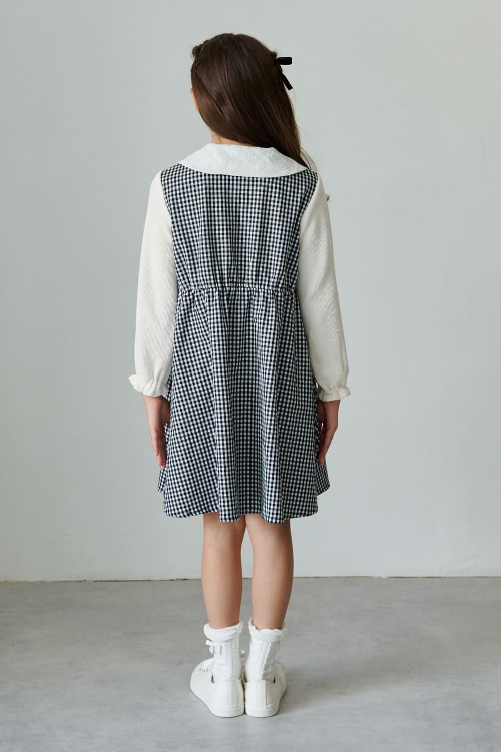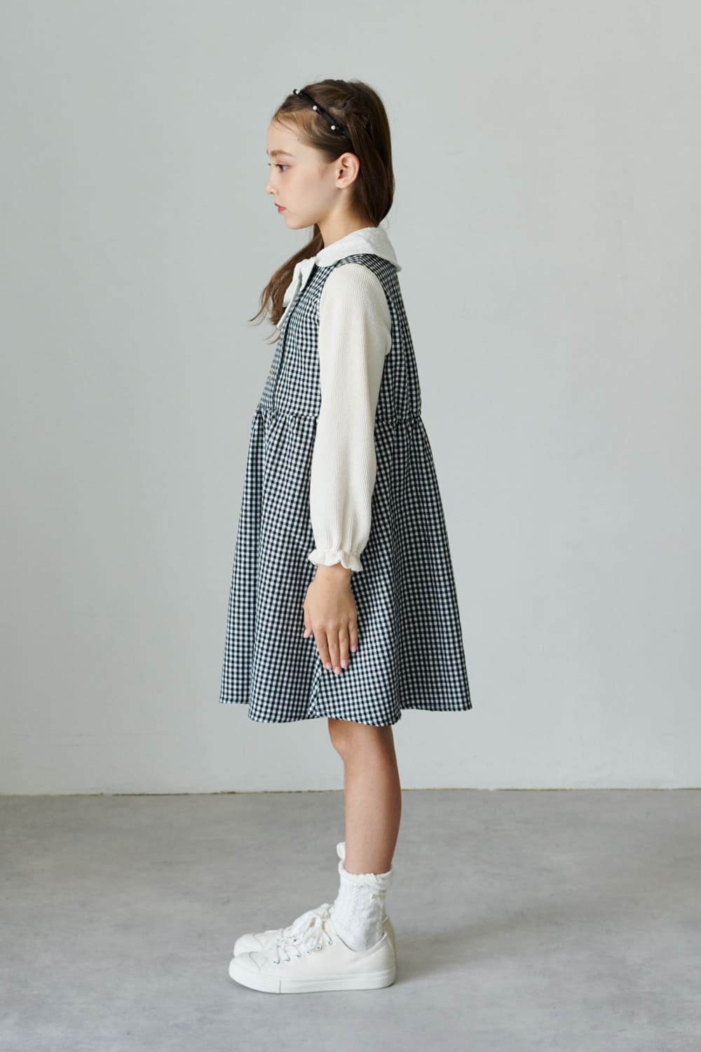 *リボン衿ギンガムチェック柄長袖ワンピース