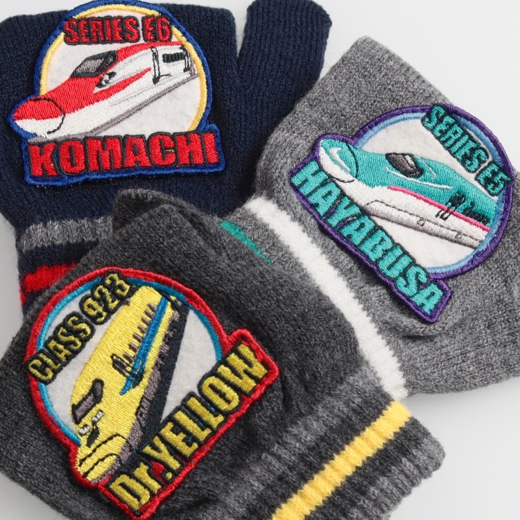 人気の新幹線のはやぶさ、ドクターイエロー、こまちのワッペンがポイントの手袋。