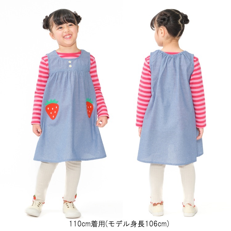 ダンガリー素材のハートの形の胸ポケット、後ろは切替デザイン、Aラインのシルエットが女の子らしい!