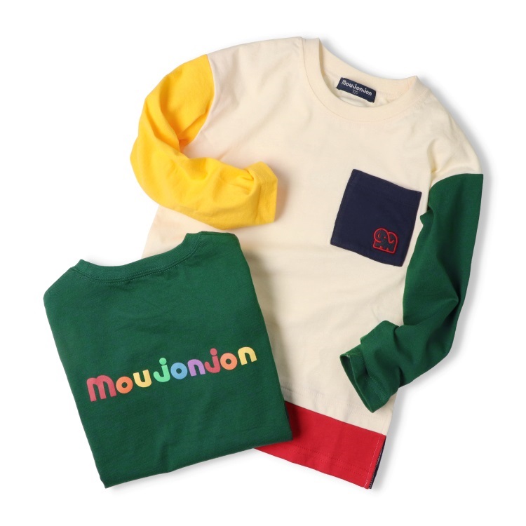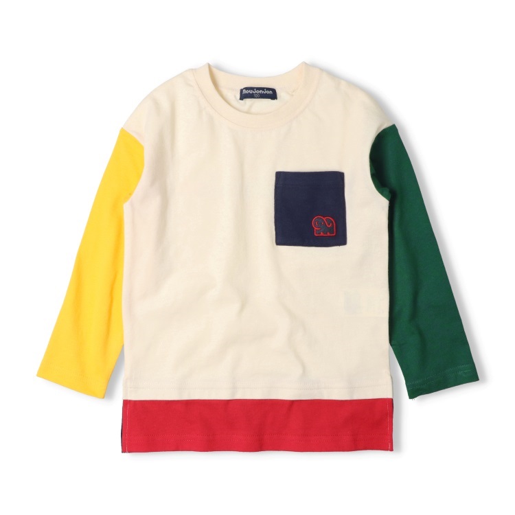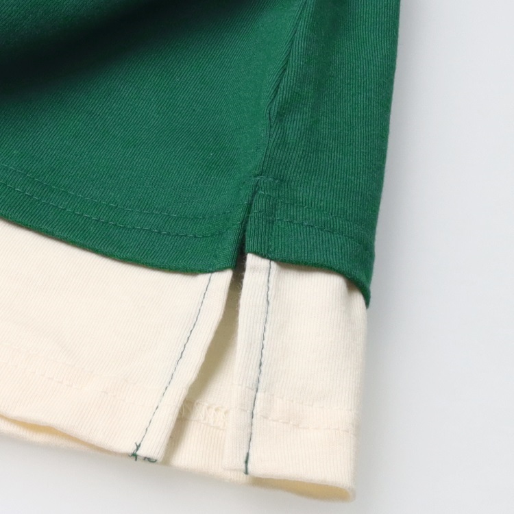裾が配色の切替になったレイヤード風、重ね着風デザインの長袖Tシャツ、ロンT。