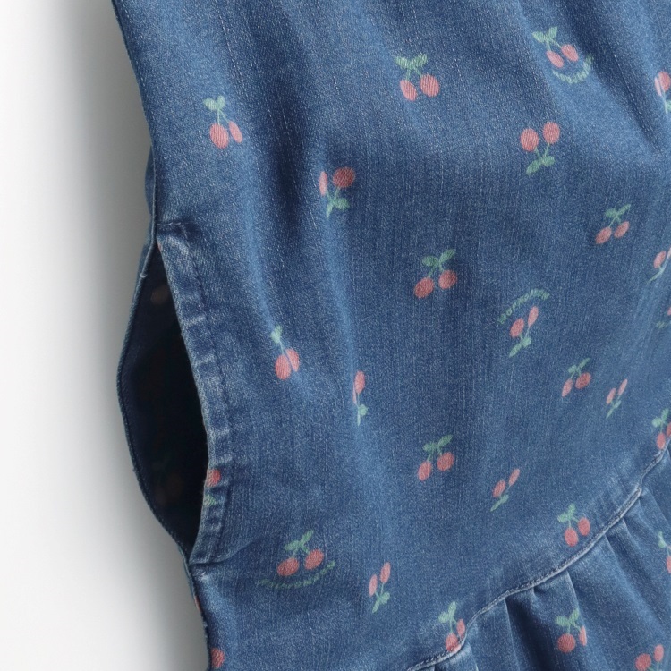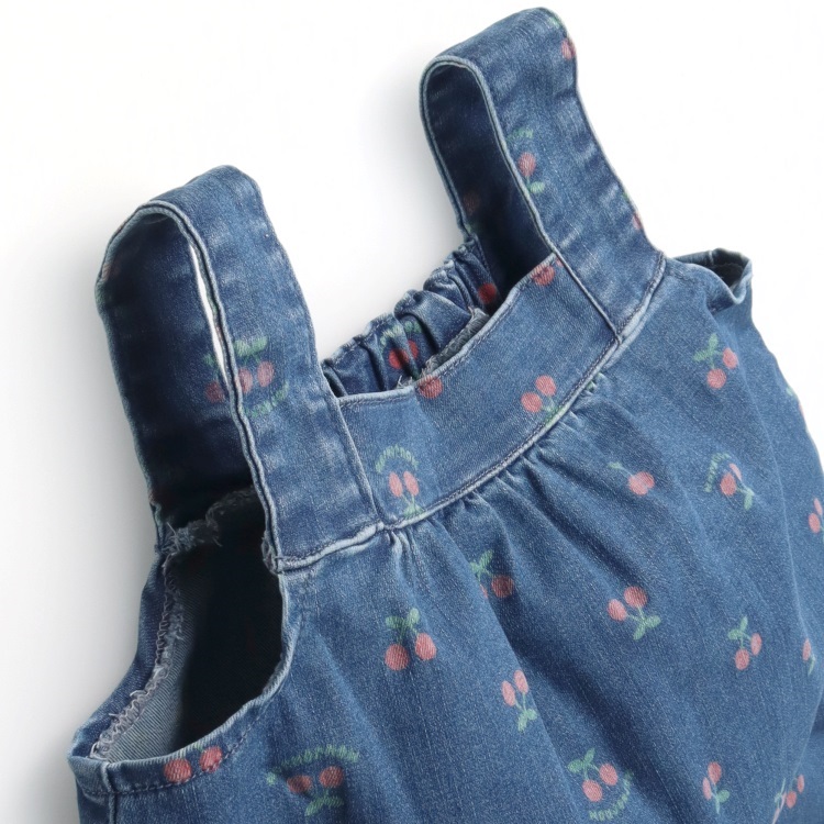 ストレッチデニムにチェリー柄をプリントしたジャンパースカート、ジャンスカ。