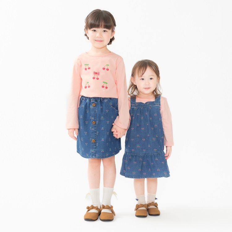 同じチェリー柄デニムのパンツ(M65000)、スカート(M65200)があるので、姉妹でお揃い、ペアコーデ、リンクコーデもおすすめ!