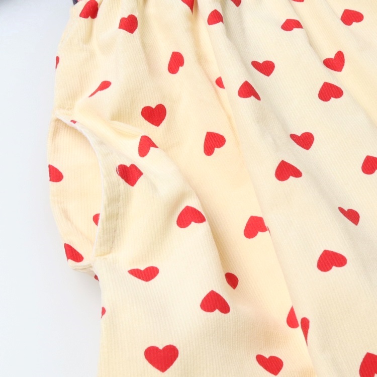 縦縞模様の凹凸感があり、伸縮性、ストレッチ性があって伸びの良いテレコ素材の長袖Tシャツに秋冬らしいコーデュロイ素材にハート柄の総柄のキャミワンピースの重ね着デザイン。