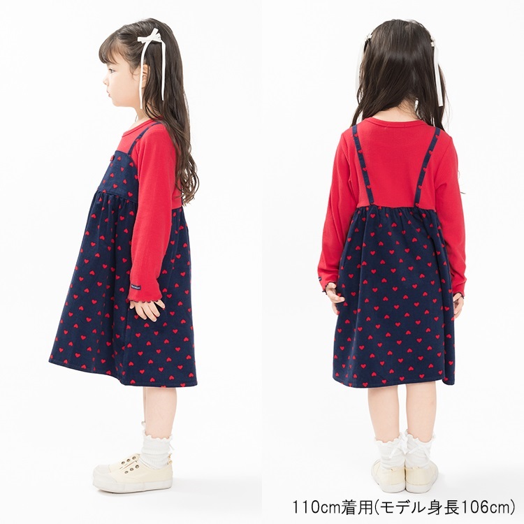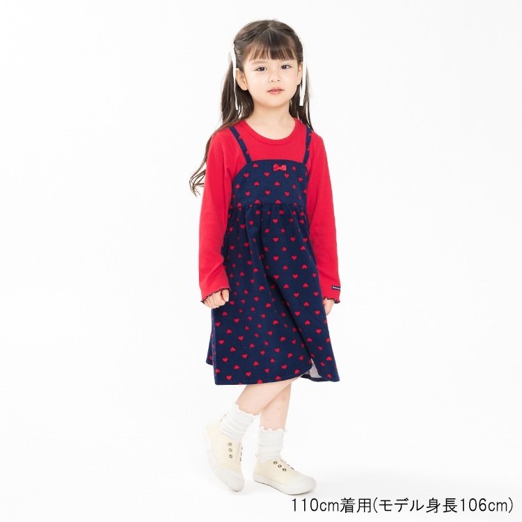 *ハート柄キャミ重ね着風長袖ワンピース(レッド-110cm)