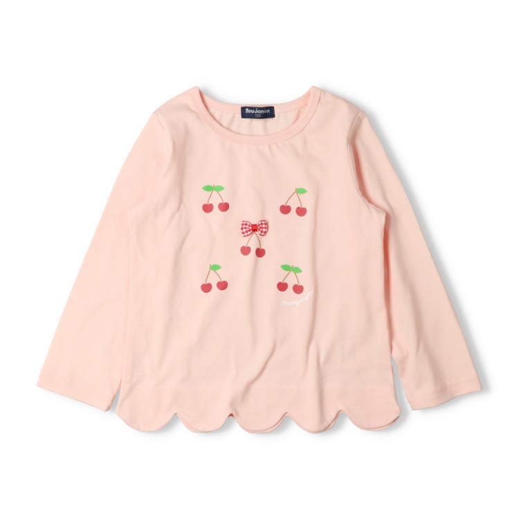 ハート・チェリープリント裾スカラップ長袖Tシャツ(ピンク-90cm)