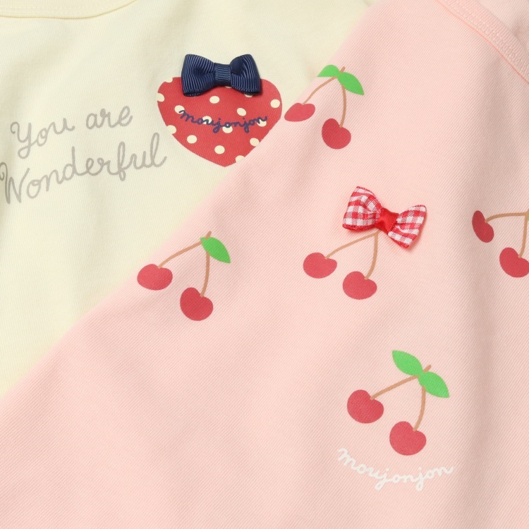 オフホワイトにはハートとロゴ、ピンクはチェリーのプリント入り。