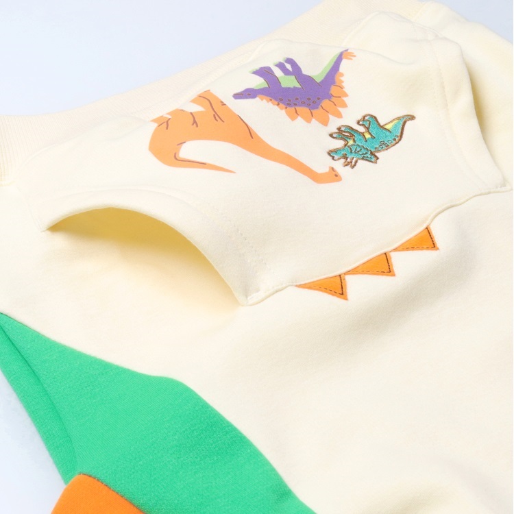 カンガルーポケットには恐竜のプリントと刺繍入り。