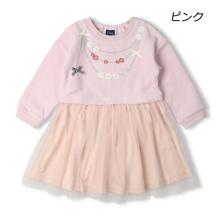 ネックレス風刺繍チュールドッキング裏起毛ワンピース(ピンク-110cm)