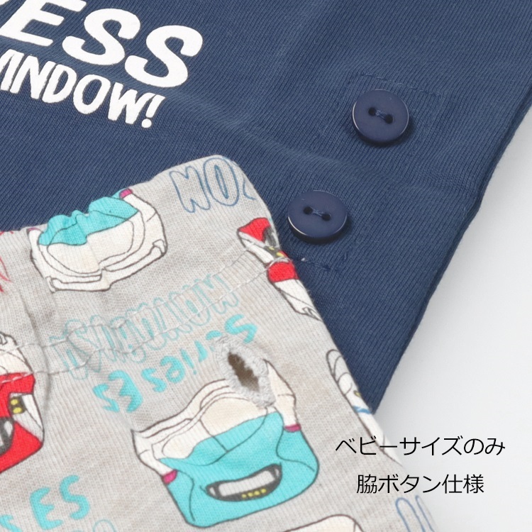 ベビーサイズのみTシャツの脇のボタンとパンツの脇のボタンホールにボタンをとめて着れば、お腹が出にくい仕様になっています。