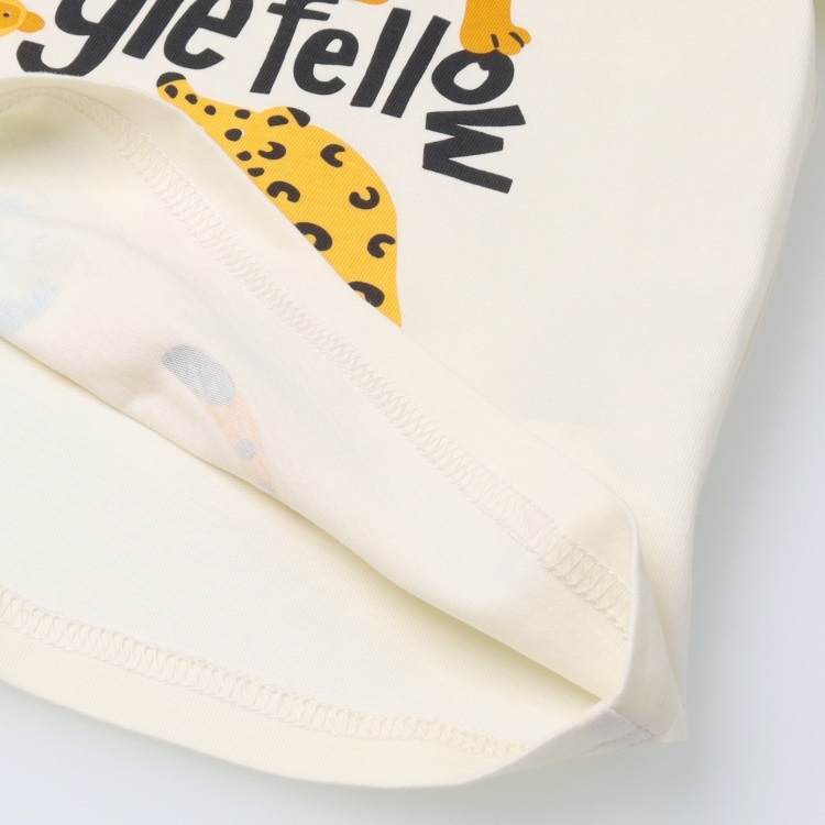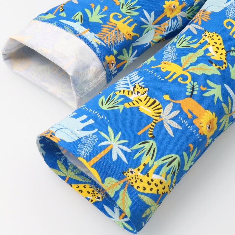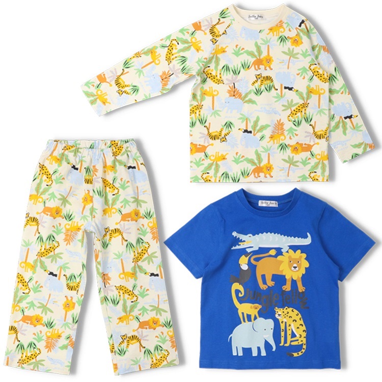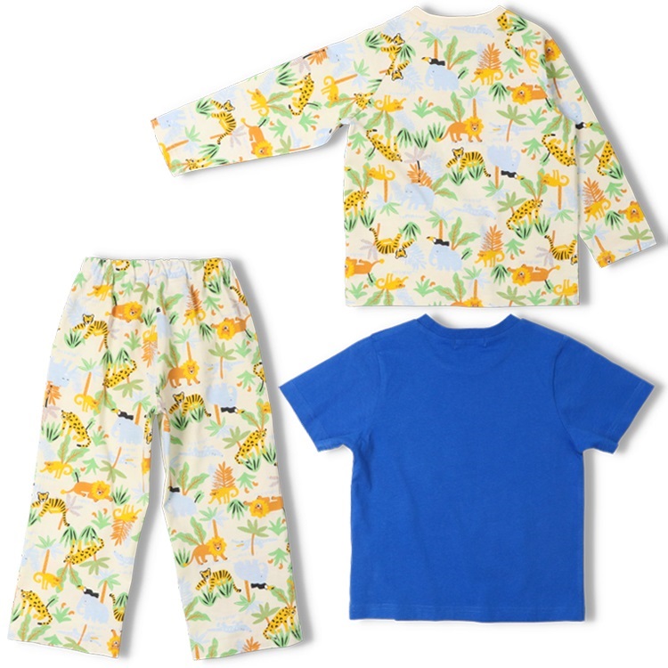 天竺、Tシャツ素材の綿100%の長袖パジャマと動物プリント入りの半袖Tシャツのセットです。