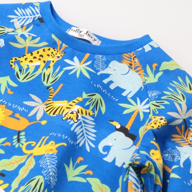ゾウやひょうやトラなどいろいろな動物の総柄プリント入り。