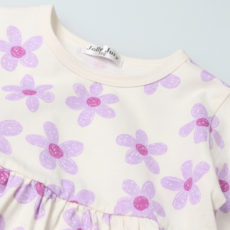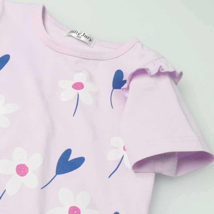 天竺、Tシャツ素材の綿100%の長袖パジャマとお花のプリント入りの肩フリルの半袖Tシャツのセットです。
