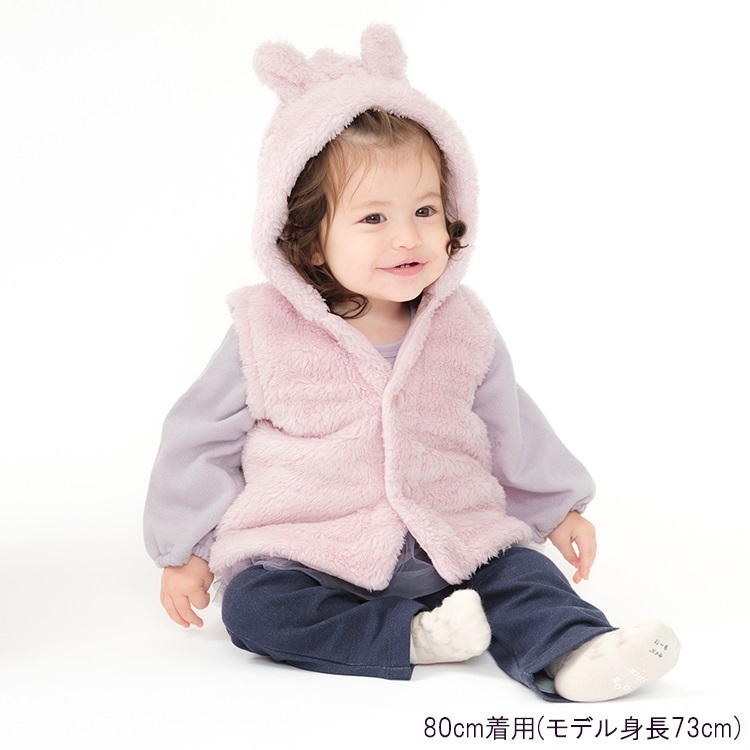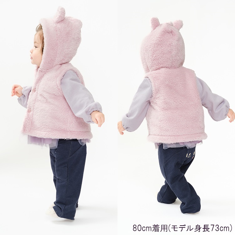 動物が目をひくもこもこボアのフードに動物の耳付の動物デザインのベスト。
